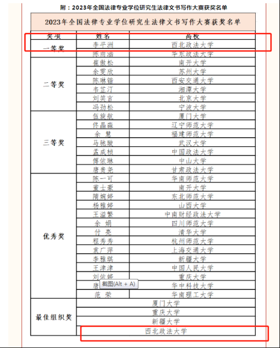 由中国法学会法学教育研究会主办,全国法律专业学位研究生教育指导委员会指导,厦门大学法学院承办的2023年全国法律专业学位研究生法律文书写作大赛圆满落幕。我校在本次大赛上斩获佳绩。