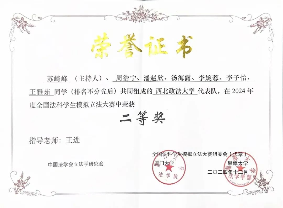 2024年12月,由中国法学会立法学研究会主办的全国法科生模拟立法大赛落下帷幕。在来自全国173所高校的激烈角逐中,由我院王进老师指导的团队,凭借《陕西省新就业形态劳动者权益保障条例(草案)》斩获全国二等奖,是我校参与全国法科生模拟立法大赛以来最好的成绩。